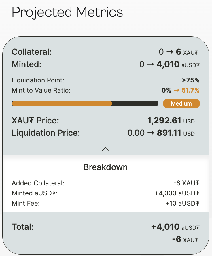 <figure><img src="https://3205030499-files.gitbook.io/~/files/v0/b/gitbook-x-prod.appspot.com/o/spaces%2FbdGQNb40oeawfru04fnk%2Fuploads%2FQ6qhSJUn1IqXEY0MaWlE%2FScreenshot%202024-06-11%20at%2015.42.27.png?alt=media&#x26;token=ac3b4a35-3952-4bfe-9b67-dfd113b88c71" alt=""><figcaption><p>In this case, the user is depositing 6 XAU₮ and minting 4000 aUSD₮ </p></figcaption></figure>